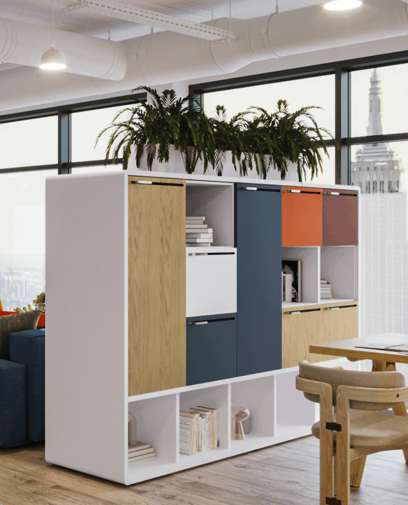 A modular workplace storage system built from the bottom up — designed to shape smarter, softer, more architectural environments.