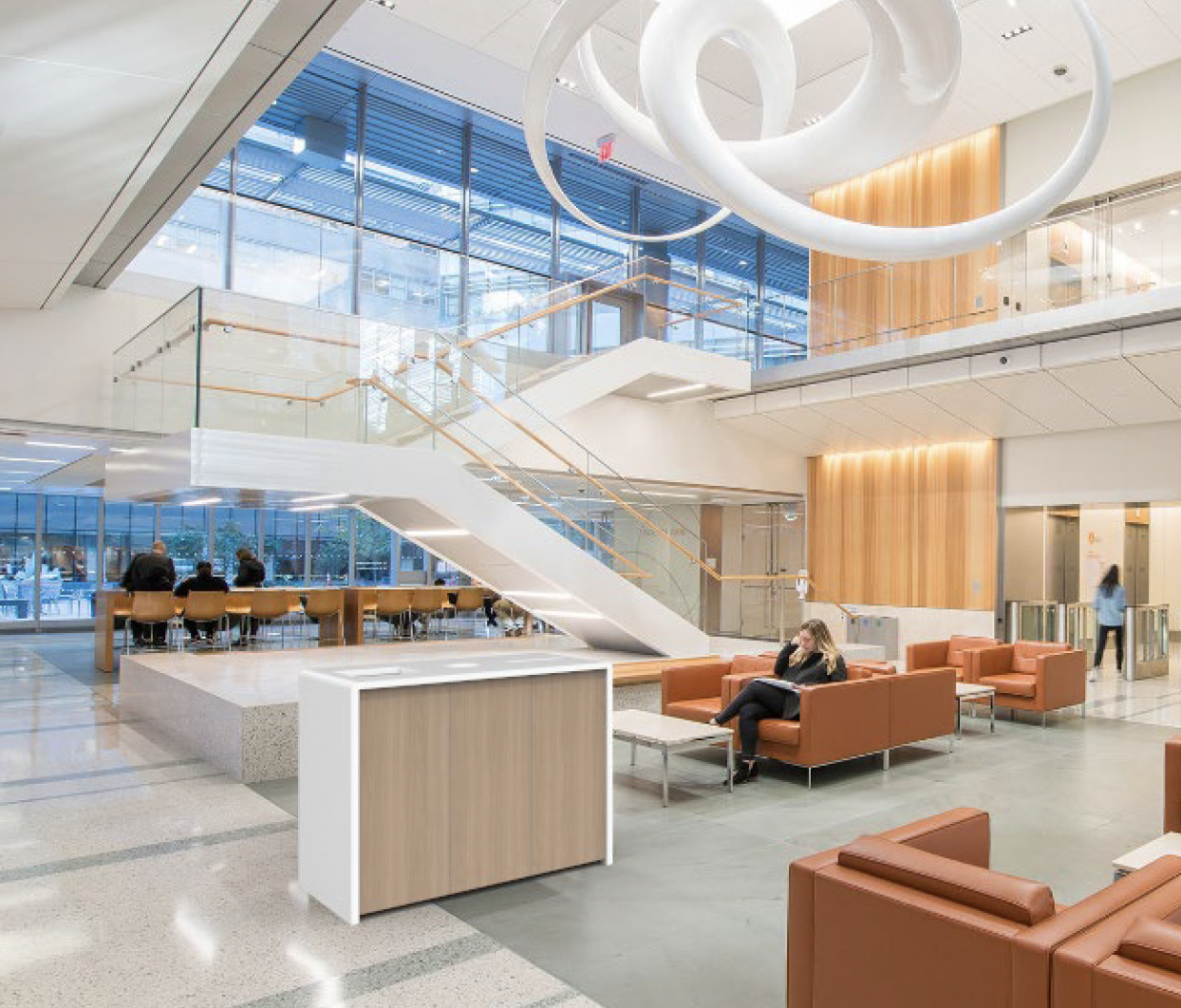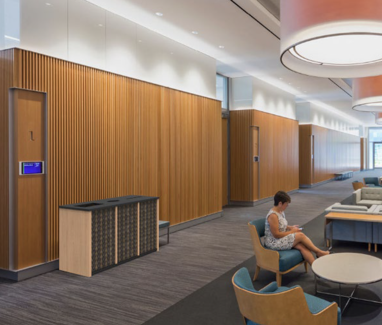Hamilton designed 20-30 custom countertop stations across two renovated floors, integrating employee lockers, collaboration space, and dual-access trash/recycling with stainless steel collars and elevated bases to keep shared office areas clean and functional.
