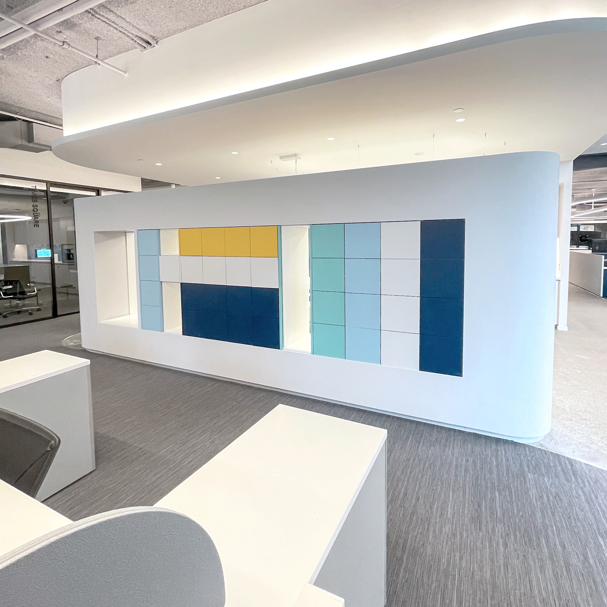 When this international insurance company needed nationwide smart locker standards, HAMILTON delivered across three floors of their Chicago headquarters. We collaborated with architects to integrate complementary seating that supports hot desking, collaborative zones, and relaxation areas—all with vibrant brand-aligned accents.